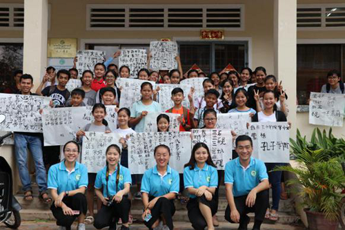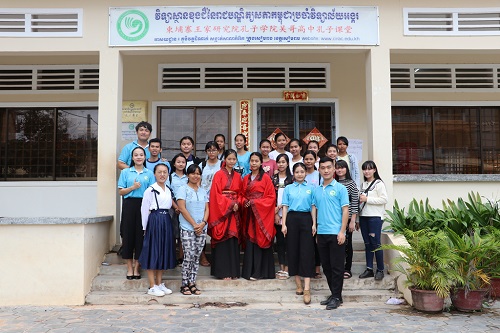 10月13日至10月20日,为庆祝孔子诞辰2569周年,柬埔寨皇家科学院孔子学院暹粒吴哥高中孔子课堂举办了“孔子学院日”系列活动。此次活动分为中国书法体验、《论语》经典诵读和汉服礼仪展示三个部分,由暹粒吴哥高中孔子课堂汉语教师志愿者周春容、叶鑫、赵静、王叶豪、蔡尚益、曾一舫策划,20余名学生参与。