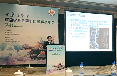 10月19日至21日,由中华医学会、中华医学会疼痛学分会主办的第十四次全国疼痛学学术年会在云南省昆明市隆重召开。临床医学院/附属医院疼痛科主任王礼彬,主治医师胡琴琴应邀出席大会,并在微创介入手术治疗专场做专题学术讲座,对疼痛科团队近年来在脊柱微创领域所取得的最新成果进行讲授。新颖独特的构思、严谨规范的操作、深入浅出的讲解,得到了主委刘延青教授、侯任主委、张达颖教授等与会专家代表的一致好评。