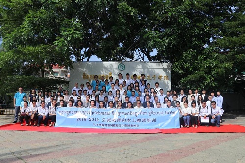 当地时间10月28日上午,由孔子学院总部/国家汉办主办、柬埔寨皇家科学院孔子学院承办的2018-2019学年柬埔寨地区公派教师和本土教师培训在柬埔寨皇家科学院孔子学院三楼会议厅顺利开幕。孔子学院总部/国家汉办师资处高级项目官员梁征、中国驻柬埔寨大使馆参赞李杰、柬埔寨皇家科学院院长宋独(SOK Touch)、柬华理事总会常务副会长兼文教师资资金会处处长郑棉发勋爵、中国驻柬埔寨大使馆领事处张卫宁先生、柬埔寨金边皇家大学DHY汉语中心负责人周丽云、孔子学院总部/国家汉办师资处项目官员王佳、柬埔寨皇家科学院孔子学院中方院长柴克清、柬方院长苏碧娜(VUTH Sopheakna)、孔子学院总部/国家汉办项目官员来永梅、志愿者管理教师张智波、田金金、北京语言大学刘谦功教授和北京师范大学孙红娟副教授等领导专家出席开幕式,来自柬埔寨全国各省80名本土汉语教师、21名公派教师和32名志愿者教师150余人参加了本次培训会。