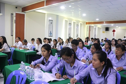 本次培训面向公派教师设置了语音•汉字•词汇专题、跨文化适应能力、教学及课堂管理案例分析和语法专题四门课程。刘谦功老师对汉语学习四要素进行简要凝练的讲解,并关注到公派教师跨文化教学的相关问题。孙红娟老师则对柬埔寨当地的课堂管理中出现的问题,予以针对性的讲解。面向柬埔寨本土教师,此次培训安排了汉语语音教学、利用教材进行有效的汉语教学、汉语词汇教学、HSK考试介绍和课堂管理技巧五个方面的课程。孙红娟老师分享了自己在语音教学、教材使用和课堂管理上的一些心得,刘谦功老师对汉语的词汇教学提出了一些建议。柬埔寨孔子学院公派教师户社芳老师作了HSKK、HSK专题介绍。参与培训的教师们都感到获益匪浅,与两位专家积极展开讨论。
