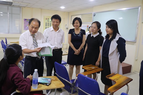 会谈后,九江市代表团在柴克清院长和苏碧娜院长的陪同下参观了孔子学院芳华大楼,柴克清院长和苏碧娜院长向代表团介绍了孔子学院教室、电子图书馆、会议室等设施以及孔子学院开展的一系列文化活动。期间,潘熙宁部长与孔子学院工作的汉语志愿者教师亲切交流,了解了汉语教师志愿者们的大致情况,并进入教室与在孔子学院学习的柬埔寨学生进行交流,鼓励其来中国学习,该学生对潘熙宁部长的鼓励表示十分感谢。