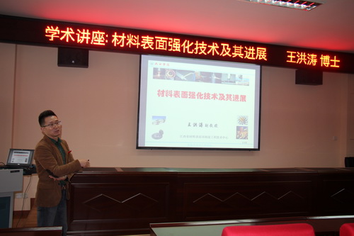 讲座伊始,王洪涛博士以设问“什么是表面强化技术?”、“为什么研究表面强化技术?”等问题入手,详细介绍了材料表面强化技术的概念以及研究材料表面强化技术的意义。材料表面强化技术包括表面涂层技术和表面改性技术,王博士重点阐述了两种技术的诸多方法种类、研究进展状况,使同学们了解到表面科学是研究固体表面的一门新学科,它有着很多应用。