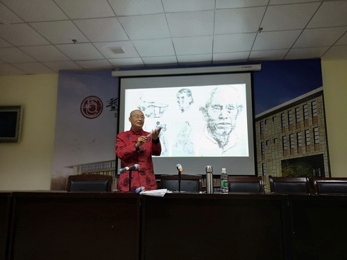 讲座一开始,吴老师就亲切的与学生进行了互动,拉近了与学弟学妹们的距离,吴老师还带来了书法作品,赠送参与互动的同学们。吴老师把这次讲座定义为学习中外大师的欣赏课、个人习作的交流课、速写实践教学课。他认为绘画的核心问题是解决绘画的能力问题,因为绘画是造型艺术。我们要解决和表现物体的立体感、空间感、质感问题。但本质的、关键的、核心的问题,还是要解决形体——造型问题。