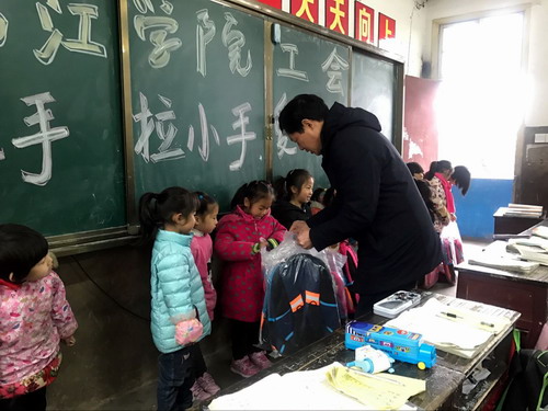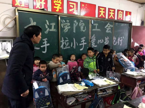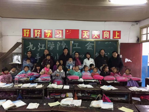 12月7日上午,伴随着绵绵冬雨,凛凛寒风,遵照校领导的指示,校工会主席金葆金和马丽君老师、王若宇老师一同前往永利yl23411集团官网扶贫点武宁县官莲乡东山村小学,为该校的25名学生送去了充满温暖的爱心书包。