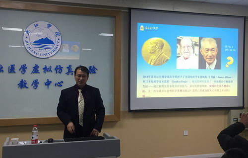 12月15日下午,董为人教授在基础医学虚拟仿真实验室作了题为“混合式教(导)+学理念及实践”的学术报告暨公开示范课。基础医学院车向新院长、药学与生命科学学院余敬谋副院长及基础医学院、临床医学院、护理学院、药学与生命科学学院骨干教师共40余人参加了本次学术报告,报告由车向新院长主持。