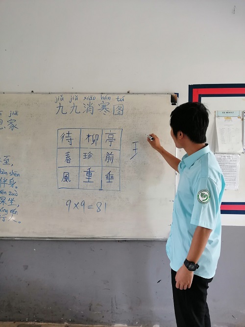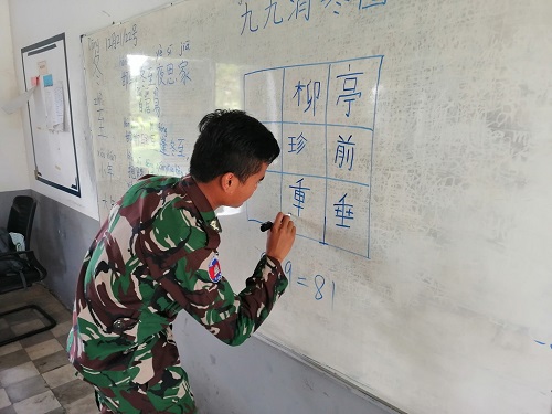 紧接着,崔晨晨老师和学生们一起诵读了唐代诗人白居易的诗歌《邯郸冬至夜思家》。“想得家中夜深坐,欢迎说着远行人”一句,军人学员们纷纷点头表示理解。随后,学生们和崔晨晨老师一起体验了一种清代的冬至民俗———“九九消寒图”。写“九九消寒图”,也称“写九”,格纸上一共九个字,每字九划,一天写一划,九九八十一天后,冬去春来,寒冷也就“消”去了。崔晨晨老师示范了每个字的笔顺笔划,并请九名学生一一在白板上“写九”消寒,体会中国古人的古意古韵。此外,崔晨晨老师还组织学生们一起合唱了冬至民谣《九九歌》,让学生们进一步了解了中国“冬至日”的文化民俗。