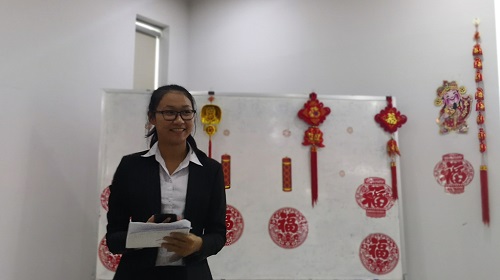 作为任课教师,来自柬埔寨皇家科学院孔子学院的甘敏副教授对“柜面服务汉语展示”活动进行了点评总结。甘敏老师对同学们良好的表现表示满意,并着重强调了规范、有序的商务汉语在工作中的重要性。此外,她还鼓励同学们继续认真努力地学习汉语,为加华集团的发展、柬埔寨的经济建设贡献自己的一份力量。