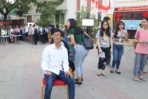 1月24日晚5时,柬埔寨皇家科学院孔子学院于孔子学院本部芳华大楼前举办以“金猪赐福,趣味运动”为主题的2019猪年春节游园会。柬埔寨皇家科学院孔子学院中方院长柴克清、柬方院长苏碧娜(Vuth Sopheakna)、孔子学院总部/国家汉办项目官员来永梅、管理老师张智波、田金金、四方国际公司董事长王军一行以及金边区公派教师、汉语教师志愿者和孔子学院两百余名学生参与了此次活动。