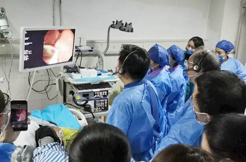 近日,由临床医学院/附属医院消化内科承办的第一届食管胃静脉曲张内镜治疗学术会议——九江地区ESVD研讨会,在该院行政楼九楼多功能会议厅成功举办。该院纪委书记刘英明出席会议,九江市及周边地区相关专业同仁近百人参加了大会。会议由医院消化内科主任蔡长春主持。会议采用了操作实时直播和转播技术,在线聆听和观看直播人数达到了数千人。