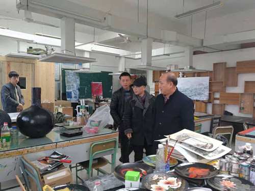 随后,王春生一行在吴天麟院长的引领下参观了南昌航空大学艺术与设计学院漆画工作室、美术展厅、产品设计工作室、环境设计工作室、视觉传达设计工作室及创新研发基地等实训场地。