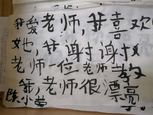 初级C班一考完试就开始了他们的书法活动,小小的个子掂着长长的毛笔,跟着老师一笔一画书写的样子,简直萌翻了。过了很久一个小姑娘害羞的将写好的书法送给老师“我的老师很漂亮!”淘气的男孩子直接表白“我喜欢老师!”还有“我爱老师,老师真可爱!”穆晓彤老师收到学生们的表白,激动地向其他老师们分享炫耀。