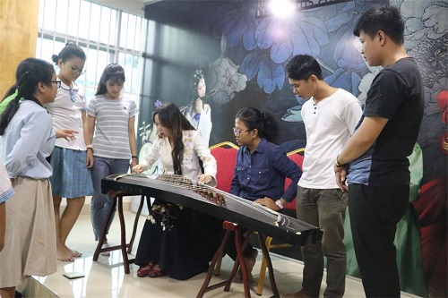 十八班武艺,孔院老师样样精通。在图书馆琴心斋,黄书老师首先为学生们弹奏了最新热门曲目《雪落下的声音》和《知否知否》,学生们被奇妙优雅的古筝声乐吸引,弹奏完毕后,现场沸腾了,学生们大赞老师琴艺精湛。围着老师,听她讲解古筝的构造、基本音符、音区和指法等乐理知识,有两位学生在老师的指导下尝试了《雪落下的声音》第一段,得到老师的肯定后,兴奋地欢呼拥抱。学生们希望以后孔子学院开一些关于古筝、书法、绘画等中华文化体验课程,从而进一步了解和体验中国文化!(文|魏梦莉 摄|温天凤)