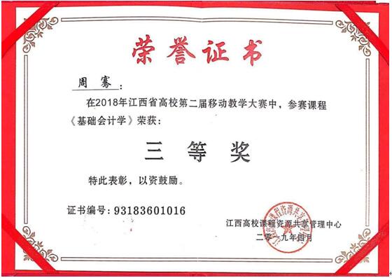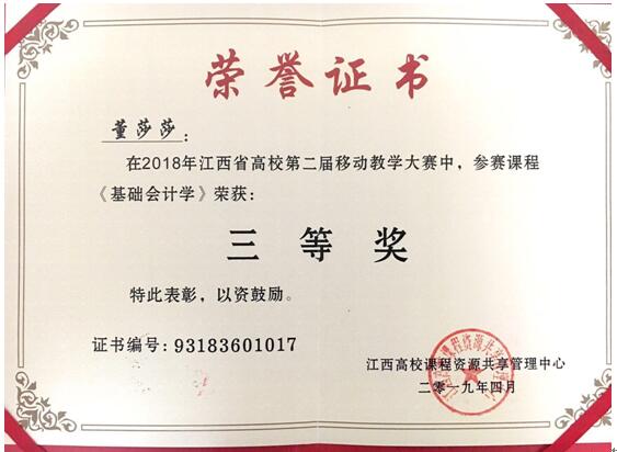 4月23日,江西省高校课程资源共享联盟年会暨学术交流研讨会在南昌国际博览城隆重召开,会上,对省第二届高校移动教学大赛获奖教师和优秀组织奖获奖学校进行了颁奖,永利yl23411集团官网周骞、董莎莎两位教师荣获三等奖,傅江宏、黄健、何刚、许成锋、袁荣华等 5名教师荣获“优秀教师”奖项,张梅等20名教师荣获“教学先锋”奖项,学校获大赛“优秀组织奖”。