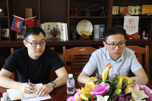 4月25日上午,孔子学院总部/汉考国际项目主管苏文鹏、市场专员赵斌二人莅临柬埔寨皇家科学院孔子学院调研指导,柬埔寨皇家科学院孔子学院中方院长柴克清、公派教师户社芳老师、黄青山老师、汉语教师志愿者黄书在孔子学院一楼会议室热情接待来宾并展开友好会谈。