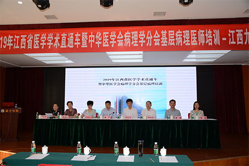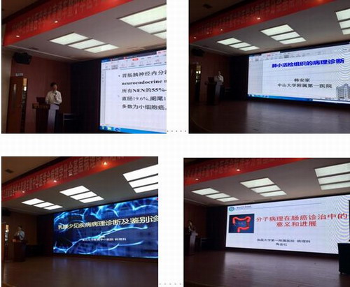 开幕式后,中华医学会病理学分会副主任委员、北京市医学会病理学分会主任委员、北京医院病理科主任刘东戈教授系统地讲授《胃肠神经内分泌肿瘤的病理诊断》;广东医学会病理学主任委员、中山大学附属第一医院病理科主任韩安家教授详细讲授《肺小标本活检病理诊断》的专题报告;复旦大学华山医院病理科副主任唐峰教授详细讲授《乳腺少见疾病病理诊断及鉴别诊断》;江西省医学会病理学主任委员、南昌大学第一附属医院病理科主任梅金红教授为大家讲授《分子病理在肠癌诊治中的意义和进展》专题授课,代表们聆听了四位专家的精彩学术报告后,结合临床实践、围绕临床热点、病理诊断难点问题和分子病理等方面展开热烈的讨论和交流。