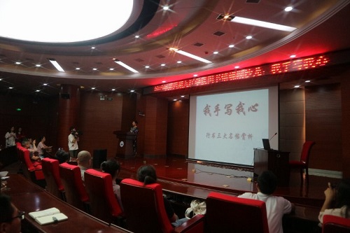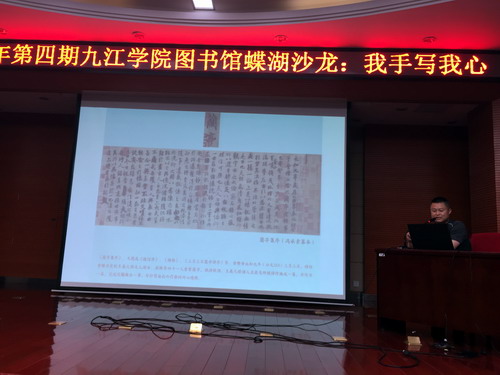 为诵读名家经典,交流求学、治学、品书的经验,营造浓郁的校园文化氛围,5月23日晚,校图书馆特邀江西省书法家协会副主席曹端阳先生和永利yl23411集团官网首届师德师风标兵吴若飞老师做客2019年第四期“蝶湖沙龙”,在逸夫图书馆报告厅为永利yl23411集团官网师生带来了一场主题为“我手写我心”的公益讲座。师生代表及校外文学书法爱好者约300多人聆听了讲座,现场座无虚席。图书馆谢艳老师及嘉宾吴若飞老师共同主持了讲座。