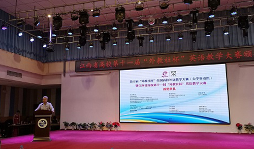 “外教社杯”全国高校外语教学大赛是全国级别最高的英语教学比赛,旨在提升外语教学质量,提高外语专业教学水平,推动我国高校外语师资队伍建设,促进教师发展,深化教学改革,探索建立具有中国特色的外语教学体系。本次大学英语组比赛由江西省教育厅和上海外语教育出版社联合主办,江西省外语学会、江西省大学外语教学研究会协办,南昌工程学院承办,共吸引来自全省40所本科院校近一百位选手参赛。省教育厅副厅长汪立夏、上海外语教育出版社副社长叶青等出席颁奖典礼。
