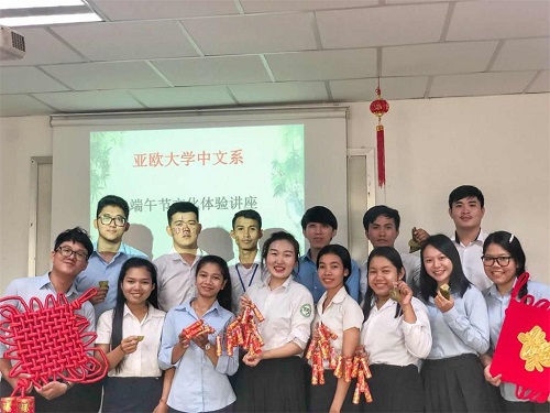 本次活动得到了亚欧大学中文系负责人刘振老师的大力支持,刘老师指出:“作为历史悠久的文明古国,丰富的民族传统节日是中国文化中不可缺少的一个重要组成部分。每个节日都有它的历史渊源、美妙传说以及独特的情趣,寄托着整个民族的憧憬,举办端午节文化体验讲座,有助于学生体验中国传统节日的魅力。”(文|柴艺斐 摄|彭秀宁Phon Sreynuy)