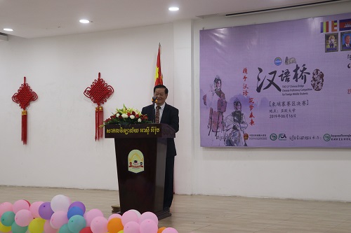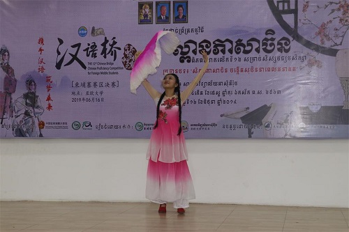 2019年6月16日上午,第十二届“汉语桥”世界中学生中文比赛柬埔寨赛区决赛在金边亚欧大学金色大楼13楼会议厅圆满落幕。本次比赛由孔子学院总部/国家汉办和中国驻柬埔寨大使馆主办、柬埔寨皇家科学院孔子学院和亚欧大学中文系承办、柬埔寨福建总商会、太子地产慈善基金会赞助。此次决赛共有来自全国各地多所中学的14名选手参加,比赛现场,来自孔子学院、亚欧大学以及华校的师生共400余人参加了此次活动。