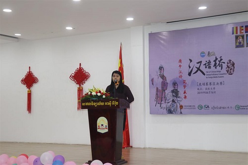 苏碧娜院长表示孔子学院作为“汉语桥”比赛的承办单位,一直以来得到社会各界的认可。她代表孔子学院对参加活动的各位嘉宾和师生表示热烈的欢迎,并对中国驻柬埔寨大使馆、参与学校和相关企业对“汉语桥”比赛的大力支持表示感谢。她为所有学习中文的学生点赞,并告诉大家,学无止境,希望大家一直保持学习汉语的热情。