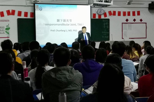 随后,李教授为临床医学院/附属医院2016级口腔医学专业本科学生进行了一整天理论授课,对TMJ内容进行讲授,附院教师到课堂观摩教学。作为口腔专业核心课程《口腔解剖生理学》的副主编,李教授数十年专研于口腔解剖生理,对该学科有精深造诣。课堂上,他不仅教授学生掌握知识内容,还告诉学生怎样记忆解剖生理,启发学生如何思考问题和做科研,鼓励学生用学习、质疑的眼光读书,培养独立思考问题的能力。他还兼用英文讲解部分内容,与同学们交流怎样学习英文,并强调了语言的重要性。
