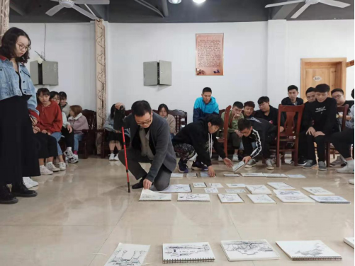 实训现场,吴小亮老师给学生讲解调研的方式和手段,强调要挖掘地方非物质文化特色,结合专业手绘表现进行元素提取,并现场给同学们做了详细的示范教学。