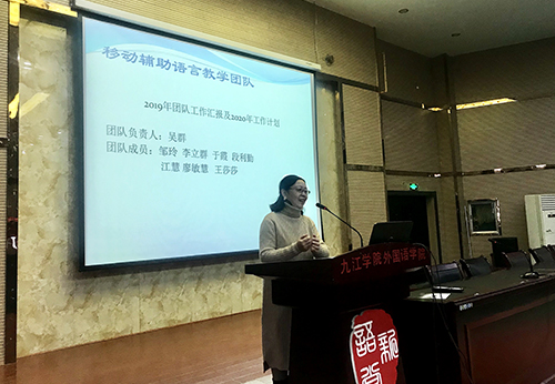 外国语学院8个教科研团队负责人依次向全院教师做了学术汇报。各负责人精心准备了PPT,详细讲述了团队一年来的学术工作进展及明年的工作目标。去年在英国做了1年的访问学者我院邹玲老师应邀也向全院教师做了访学成果汇报。