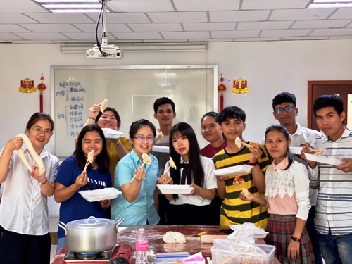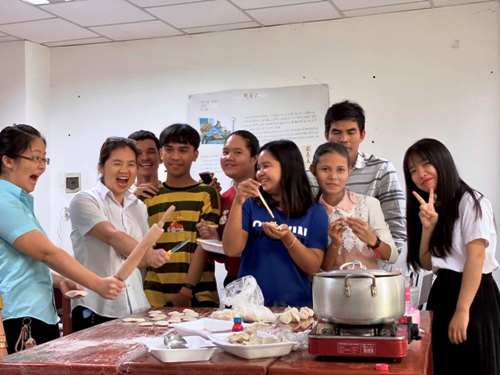 12月28日,孔子学院春节乐列活动在柬埔寨皇家科学院孔子学院亚欧大学中文系开启,孔子学院教师志愿者曾九龄、戴嘉维、王雅琪及亚欧大学中文系大四周末班的全体学生共同举办包饺子文化体验活动。