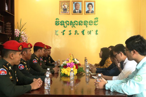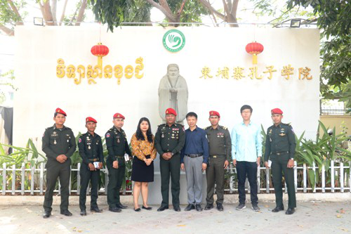 1月17日,中国传统春节来临之际,柬埔寨王家军特种伞兵部队911旅副司令孙桑德(BG. SUM Samnang)一行6人访问柬埔寨皇家科学院孔子学院,孔子学院中柬方院长柴克清、苏碧娜(Vuth Sophakna)热情接待了客人。