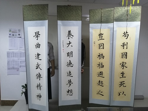 第三个环节是书法作品交流和赠送。在专业又不失幽默的书法知识讲授后,在座的师生都兴致盎然,在台下纷纷执笔创作,在书法中感受汉字的神奇魅力。王老师走下讲台亲自进行指导,他表示同学们的热情和认真都体现在了一笔一划之中,其中,他尤其喜爱彭书平同学的书法作品,并与该学生互换书法作品留作纪念。最后,为庆祝柬埔寨皇家科学院孔子学院成立十周年,王祖刚老师代表九江学院向亚欧大学赠送了两副由他亲笔题写的对联,表达了九江学院对亚欧大学全体师生的勉励。
