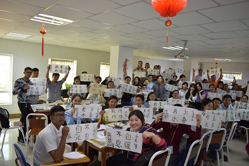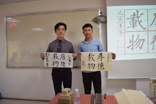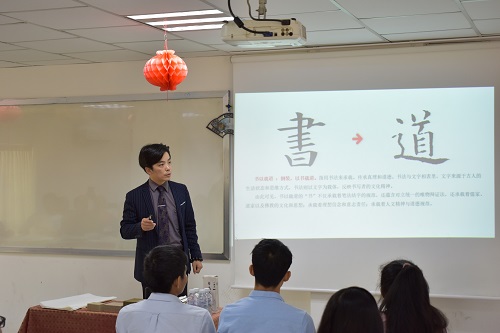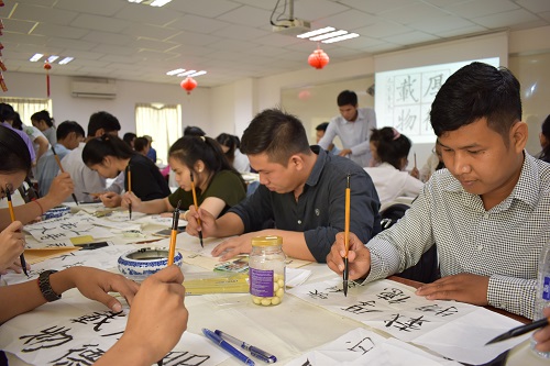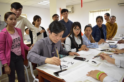 为庆祝柬埔寨皇家科学院孔子学院成立十周年,同时,为了提高亚欧大学中文系学生的汉字书写水平和中国文化素质,进一步丰富和加强亚欧大学的中国文化教育和传播工作,12月21日上午9点,九江学院的知名书法家王祖刚老师在柬埔寨皇家科学院孔子学院亚欧大学中文系501教室作了“书以载道,墨路传香”的书法讲座,亚欧大学中文系教师及亚欧大学近50名学生共同聆听了本次讲座。