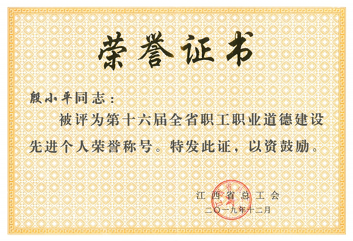 临床医学院/附属医院一直重视全院职工的职业道德建设,积极培育和践行社会主义核心价值观,广泛开展职工职业道德建设活动。殷小平副院长立足岗位,忘我工作,并带领广大职工锐意进取、埋头苦干,为九江卫生事业及卫生教育事业不断做出新的贡献。他曾被评为江西省百千万人才、井冈之星青年科学家培养对象、江西省教育厅中青年骨干教师、九江市十大杰出青年、首批九江名医、江西省远航工程人选、南昌大学赣江特聘教授等。此次获授“全省职工职业道德建设先进个人”荣誉,九江市仅两人。