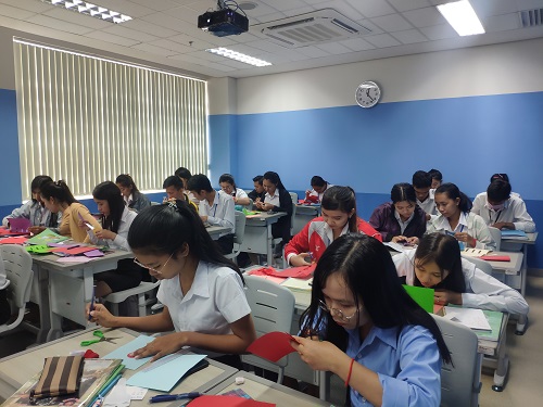 为庆祝柬埔寨皇家科学院孔子学院成立十周年,柬埔寨皇家科学院孔子学院银行学院汉语中心于2019年12月19日举办了主题为“春秋十载,祝福与期待”的文化活动。此次活动以制作贺卡和歌唱作为主要内容,由银行学院汉语中心汉语教师志愿者苏晓君策划、组织,银行学院初级中午班全体同学参加。