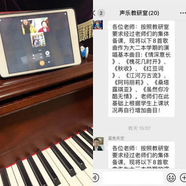声乐教研室在网络授课期间,在基础教学的同时,把正能量的歌曲教授给学生,希望他们能够在学习的同时,也能有积极向上的心态面对疫情。孔江闽教师参与江西省及九江市多个抗疫歌曲的演唱,郭泗茂教师也创作录制了抗议歌曲并获得很好的反响。
