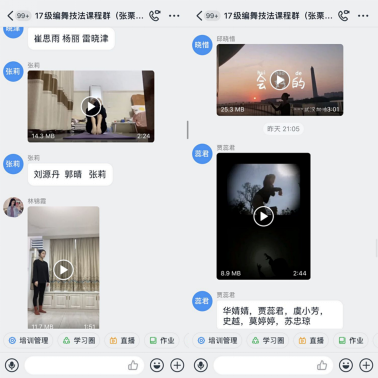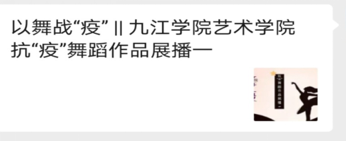 舞蹈教研室在线上教学期间,教师们认真对待每一门网络课程的教授,虽然无法进行面对面的教学,但利用现代科技手段,把舞蹈教学送到每个学生的家里面。如舞蹈学专业A1731/A1721的学生们,在顺利完成了第一堂课的编舞作业,同学们创作了十余个关于“疫情”主题的舞蹈视频,并选入江西省舞蹈家协会“以舞抗疫、抗击疫情”主题舞蹈作品展。教师们在授课过程中给学生带去正确的引导,为学生提供展示的平台,展现九江学院学子在这次疫情期间积极向上的心理状态。学生们的创作和教师的指导是值得肯定和称赞的。