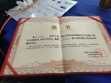 特别值得一提的是,颁奖仪式结束后,“JJUSec 1战队”中的4名大三同学因为成绩优秀直接获得了深信服科技有限公司职位聘书。