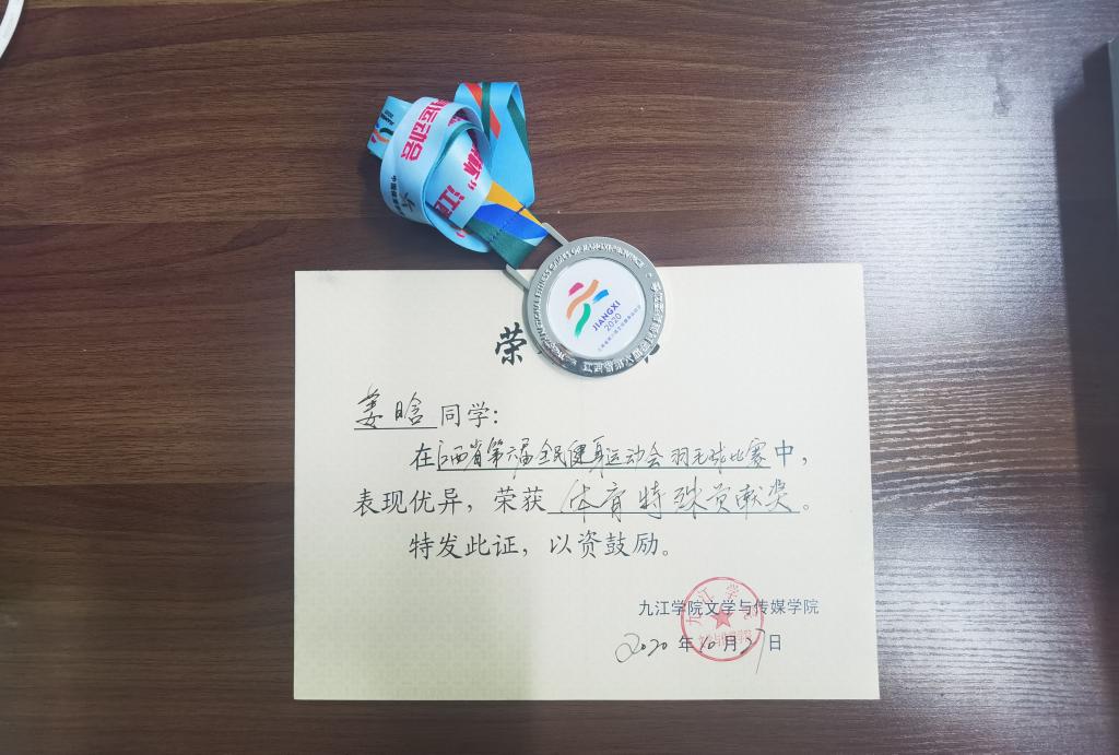 在江西省第六届全民健身运动会羽毛球比赛中,姜晗同学以饱满的热情和高度的积极性投入比赛,不畏强手,冷静应对,赛场上顽强拼搏,赛场下总结经验,充分展示九院学子积极向上、努力进取、意气风发的精神面貌。副校长陈春生在会谈中,勉励姜晗继续努力,在完成学业的同时,继续保持良好的竞技状态,希望在羽毛球运动方面取得更好的成绩。