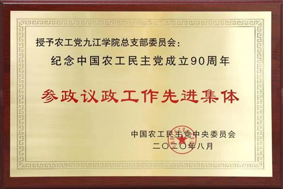 近期,农工党中央对新时代以来,特别是对农工党十六大以来,在参政议政、社会服务、组织建设、宣传思想、党史和理论、机关建设各项工作中作出突出成绩的优秀组织、优秀党员、优秀党务工作者、先进集体、先进个人进行了表彰。农工党九江学院总支部委员会被中国农工民主党中央委员会授予“参政议政工作先进集体”荣誉称号。