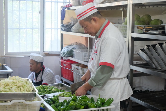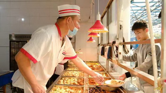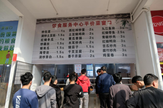 学校五食堂那小小的平价窗口,门面算不上气派,但是朴素整洁。每天清晨,大兵和他的同事们像部队出操一样,准时为学校同学们准备一天的饭菜。大兵师傅的窗口菜品种类很多,有时由于来就餐的同学太多,他和同事有些忙碌。