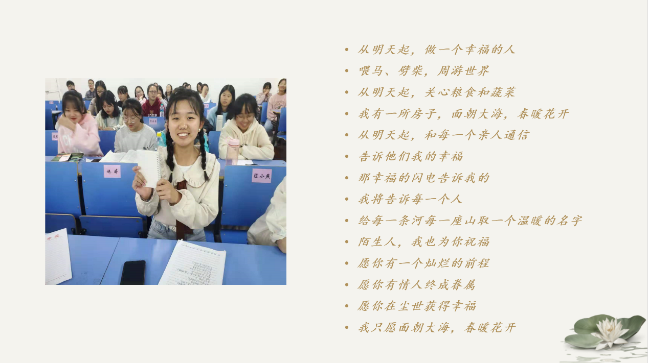 “读书会结束之后,我依然沉浸在思考中。看着落叶归根,看着人群集散,看着万物生灵,如果它们也有这样的疑惑,我们又能向谁追问求知呢?其实,不论怎么样,我们只要坚定信念,谁都是主角,谁都是真实的。因为我们在成长过程中的每一份付出,每一滴汗水都是发自我们内心的。真理不就是需要我们这样踏踏实实,无所顾忌地去探寻吗?”