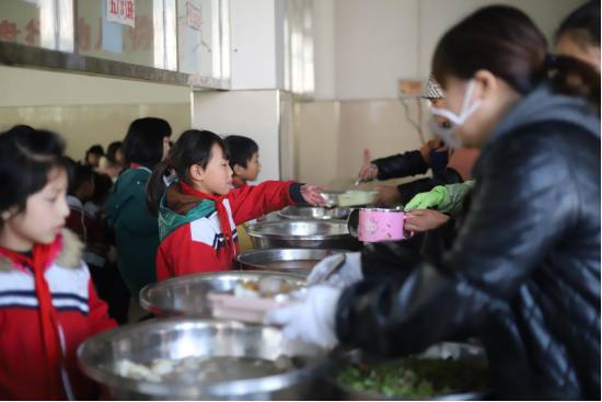 据了解,食堂的资金来源于每个月学生及老师所交的100元伙食费,全校五百多人也就是五万多元的伙食资金,平摊下来每个人每餐能用的不足3元,但食堂阿姨却能用一双巧手给孩子们带来这样美味可口的饭菜,大家都吃得很开心。进入食堂之后,有学生拿着饭盒,带着汤盆,还有孩子带着从家里果树上摘来的橙子……“轮到我了”“阿姨我今天要两块饭,我能吃完”……阳光灿烂下,这是食堂里热闹的场景。