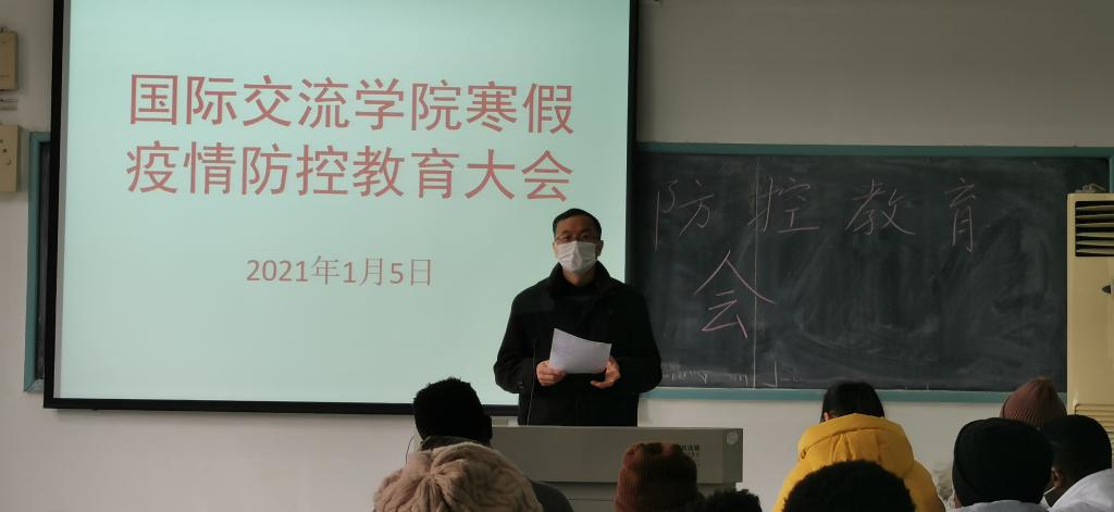 会议传达了省、市和学校关于春节寒假疫情防控的文件精神,希望留学生们严格遵守学校疫情防控规定,做好个人防护。国际交流学院院长夏修龙就学院的寒假期间疫情防控工作作了说明,详细介绍了中国疫情形势、防控具体措施、注意事项、学生日常管理等,留学生们认真听讲,就疫情防控、校园生活、请假外出等提出问题和建议,在场的老师一一进行了解答。