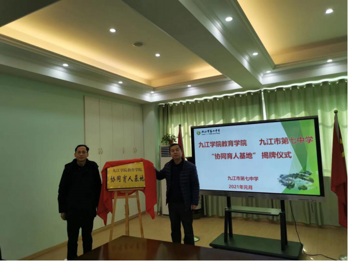 在与会人员的共同见证下,教育学院院长王殿元与九江市七中校长李青代表两校共同为“协同育人基地”进行揭牌。
