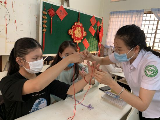 活动中,文化赏析与浸入式体验融为一体,学生在学中做,在做中学。在为时1小时的书法与对联体验中,主持教师讲解了对联的前世今生,进行了书法带练活动,随后带领学生制作属于自己的对联,并进行成果展示。在剪纸的艺术主题活动中,教师教授了平面剪纸、剪纸、阴刻和阳刻等不同种类的剪纸做法,教室里堆满了学生们自己制作的各色剪纸作品,这些剪纸将在春节活动中担任重要的装饰品。“孔院好声音”活动教室里,美妙婉转的歌声不绝于耳,学生情绪高涨,现场气氛活跃。观看《过年——团圆的味道》纪录片后,学生们交流了自己对“团圆”的看法,介绍了柬埔寨新年的习俗,分享了与家人共度新年的故事。