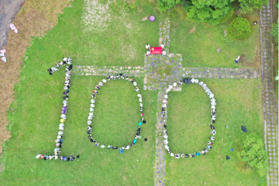这次野外实习正逢中国共产党建党100周年之际,6月3日,参加此次野外实习的全体师生在中国科学院庐山植物园实训基地,冒雨展开党旗摆出了100周年字样,向党旗告白,向云端表白:红心向党,不忘初心!
