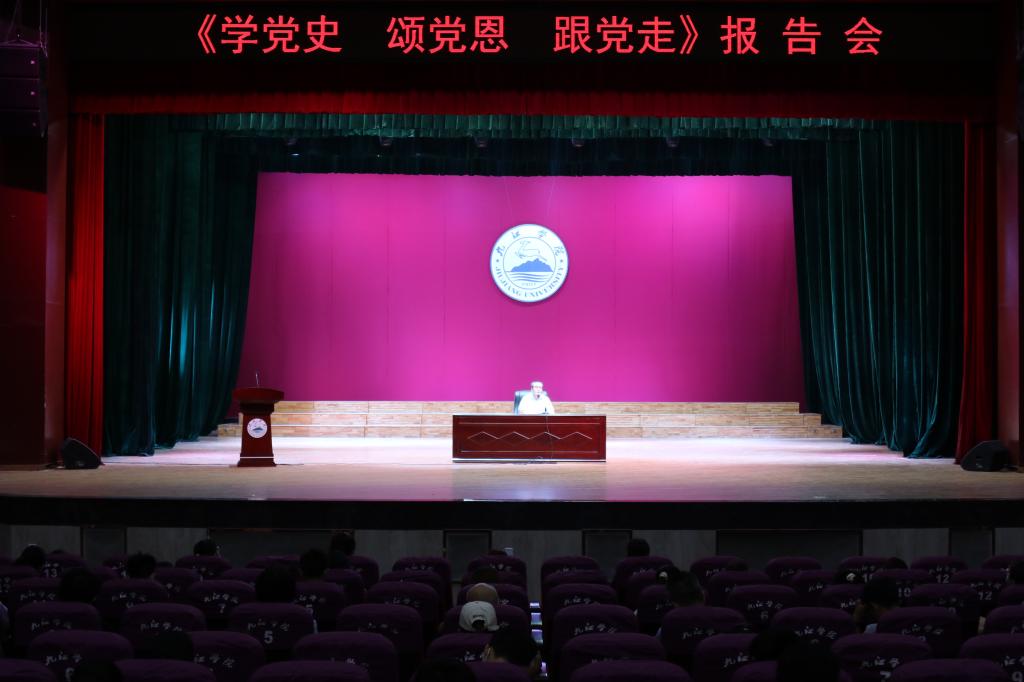 6月9日下午,九江市庆祝建党一百周年“学党史 颂党恩 跟党走”宣讲团成员、原中共九江市委党校副校长、九江市关工委报告团副团长钟万祥教授在永利yl23411集团官网主校区大礼堂作宣讲报告。市关工委副主任、报告团团长王剑,永利yl23411集团官网党委委员、宣传部部长冯健,市文明办主任吕晓芬,共青团九江市委副书记沈承峰,市教育局、市关工委有关干部和主校区师生代表近300人聆听报告。