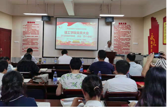 6月28日下午,副校长夏启国到建工学院望庐楼211参加了全院党员大会,听了建工学院党委书记齐清波同志讲授的专题党课——学习改革开放史,坚定“四个自信”。