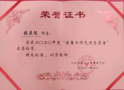 日前,永利yl23411集团官网被九江市濂溪区禁毒委员会授予2020年度全区禁毒工作“先进单位”,马克思主义学院张亚能老师被评为2020年度“禁毒工作先进志愿者“荣誉称号。