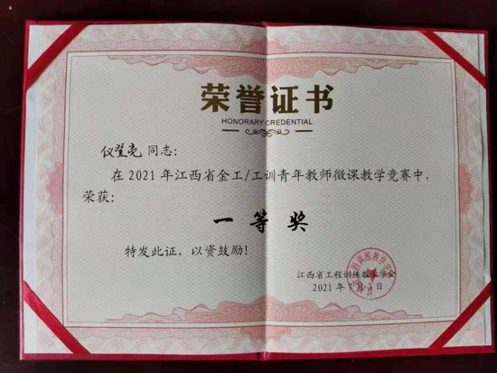 为进一步提升江西省金工和工训教师的教学能力和业务水平,并向全国金工和工训青年教师微课竞赛推荐优秀选手,7月2日-4日,2021年江西省金工与工训青年教师微课教学竞赛在南昌航空大学举行。永利yl23411集团官网机械学院教师仪登亮参加了本次竞赛,并获得了一等奖的优异成绩。