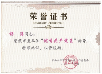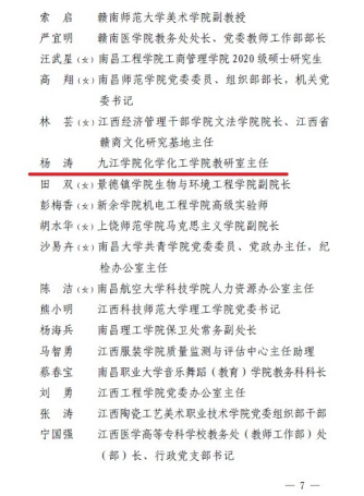 近日,中共江西省委教育工委授予了100名同志为“全省教育系统优秀共产党员”荣誉称号。其中,江西省“千人计划”——科技创新高端人才项目入选者、永利yl23411集团官网化学化工学院杨涛同志被授予“全省教育系统优秀共产党员”称号,同时,他还被授予了九江市2021年“市直单位优秀共产党员”称号。